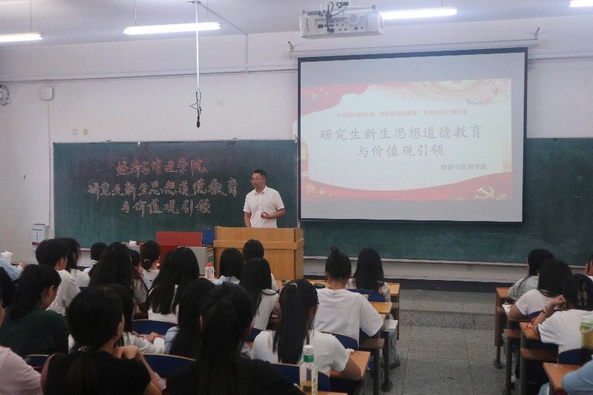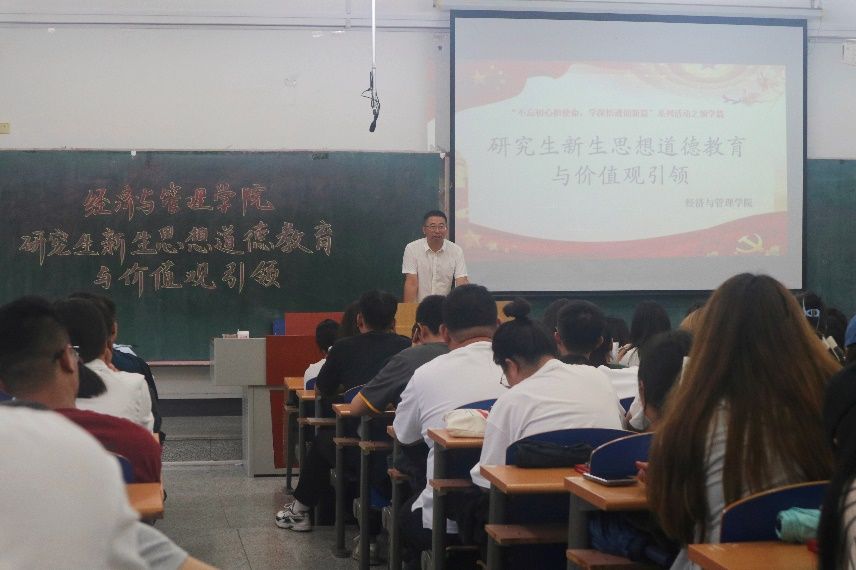 于9月9日下午1点30分,在崇师楼D区203召开了研究生新生思想道德教育与价值观引领专题领学活动。本次领学活动由研究生辅导员赵东威老师担任主讲,全体2024级研究生新生共计140人参加本次活动。