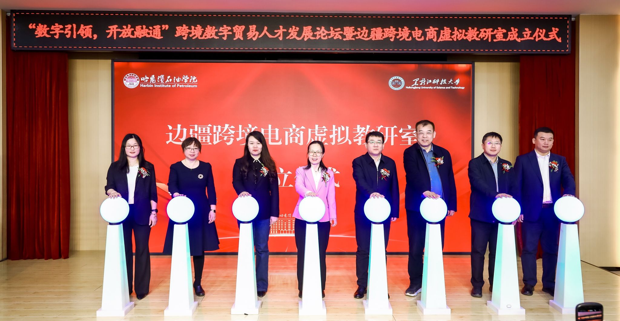 论坛现场,来自省内多所高校的专家学者与企业代表齐聚一堂,就跨境电商领域的教育教学与科研合作展开深入交流。成立仪式由哈尔滨石油学院副校长康平军主持,教育部高校电子商务类教指委委员杨兴凯,省教育厅高教处副处长何大超、哈尔滨石油学院校长王义宁等嘉宾出席并致辞,共同见证了边疆跨境电商虚拟教研室的正式成立。