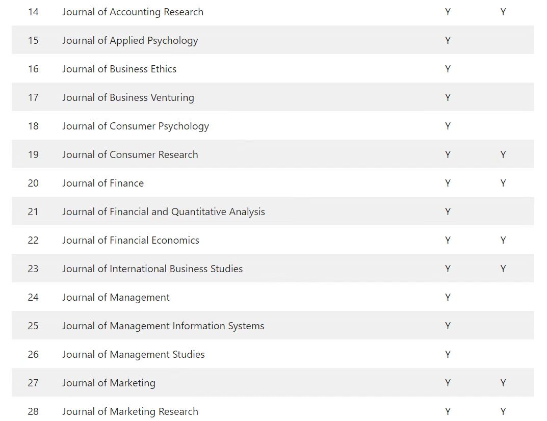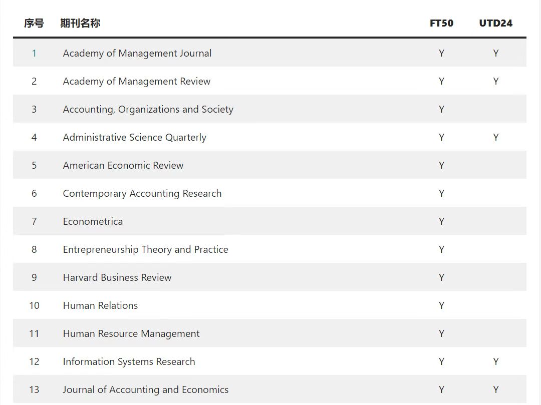 FT50期刊与UTD24期刊分别是英国《金融时报》(Financial Times)与美国德克萨斯大学达拉斯分校(UT Dallas)用以编制国际商学院排行榜的顶级商业期刊。