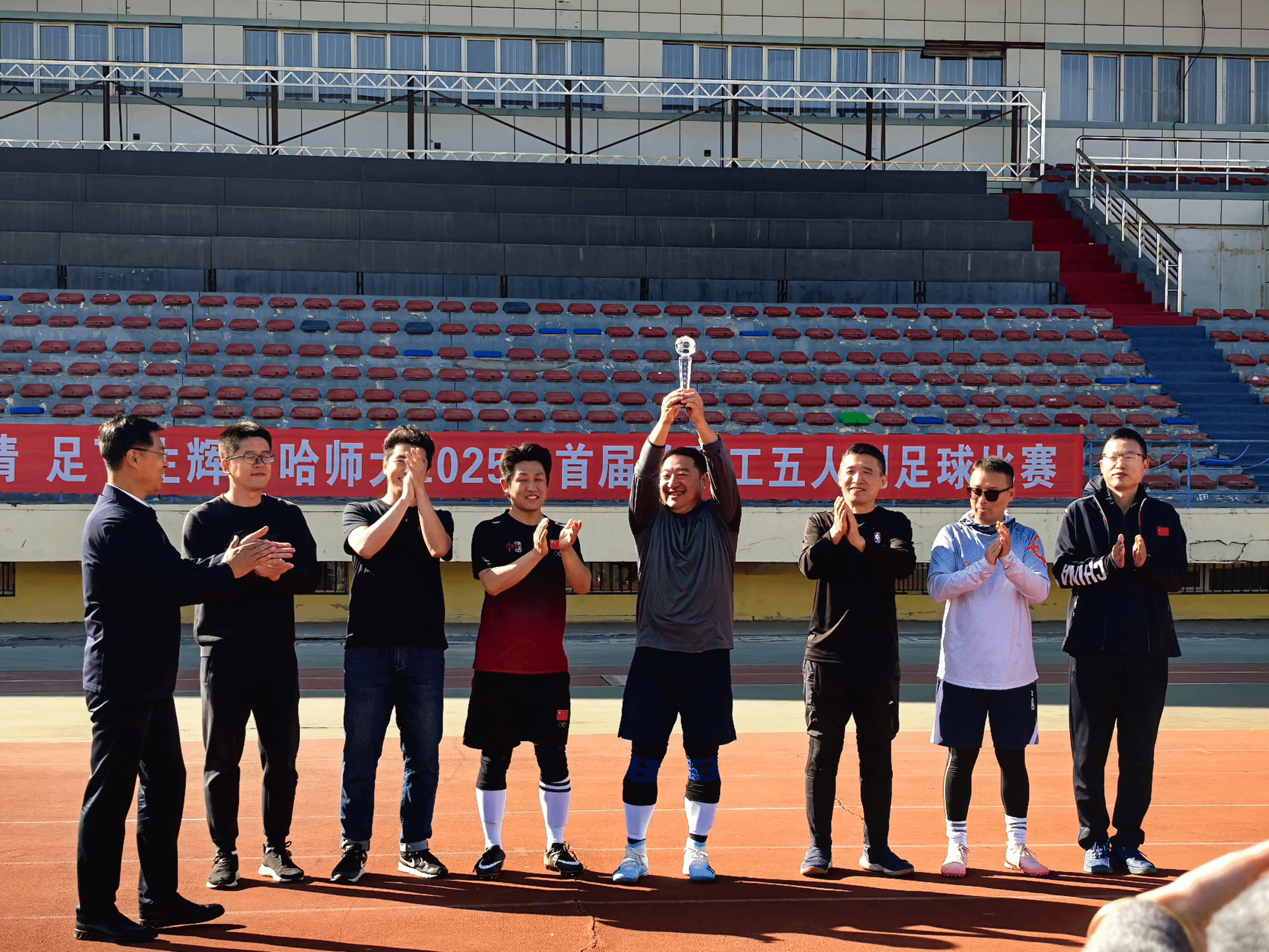 教职工男子足球队的队员们紧紧相拥——在“绿茵燃情 足下生辉”2025年首届教职工五人制足球赛的7天角逐里,足球高清直播